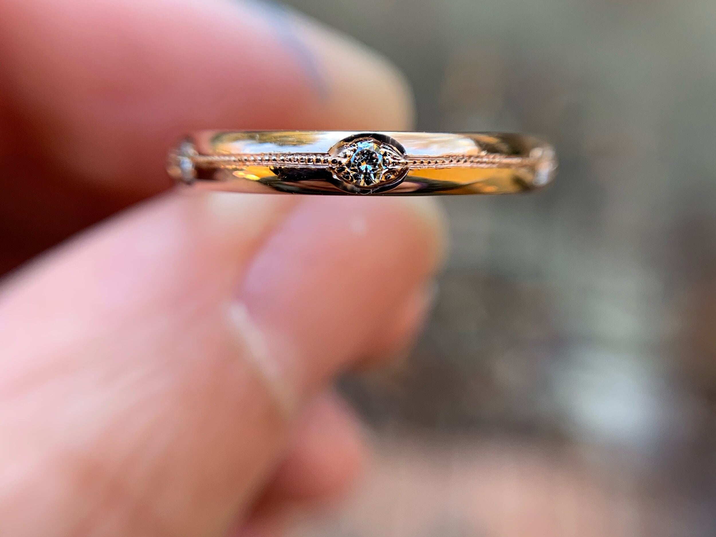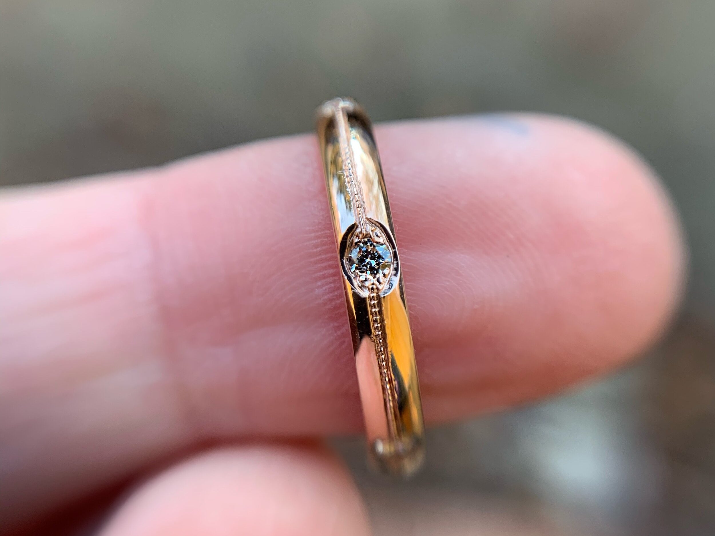 2.5mm 14k rose gold band with hand engraved milgrain details