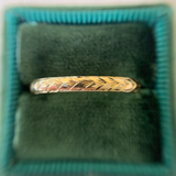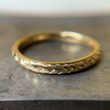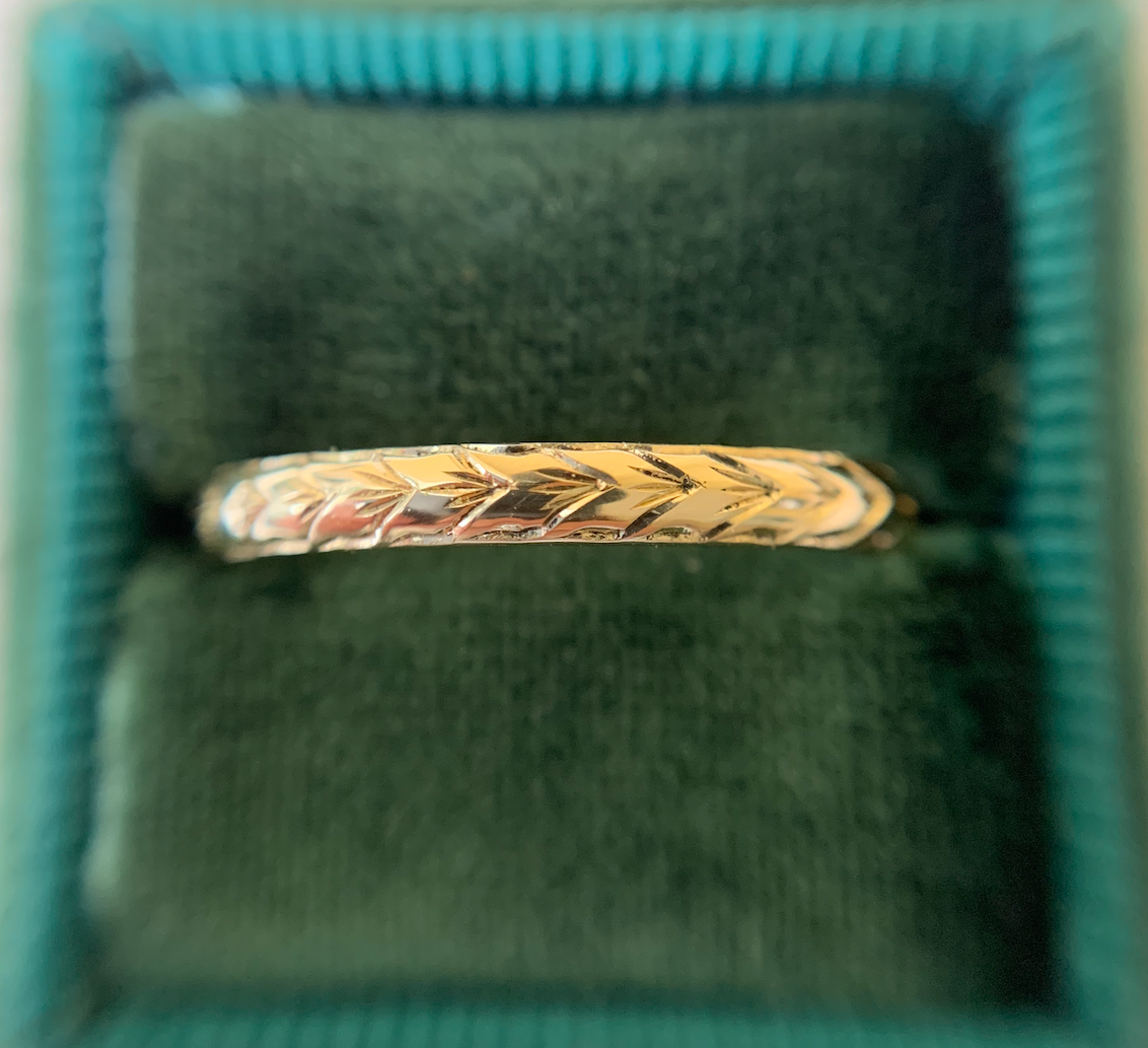 Fully Hand Engraved with a layered tulip pattern engraved 3/4 way around the band