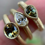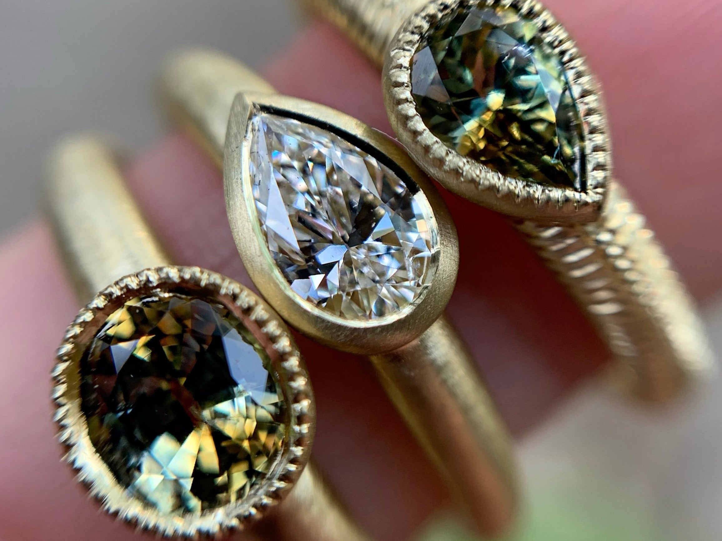 We use 100% recycled precious metals, Canadian-mined diamonds, Montana-mined sapphires, and recycled African-mined diamonds sourced from vintage jewelry. Learn more here.