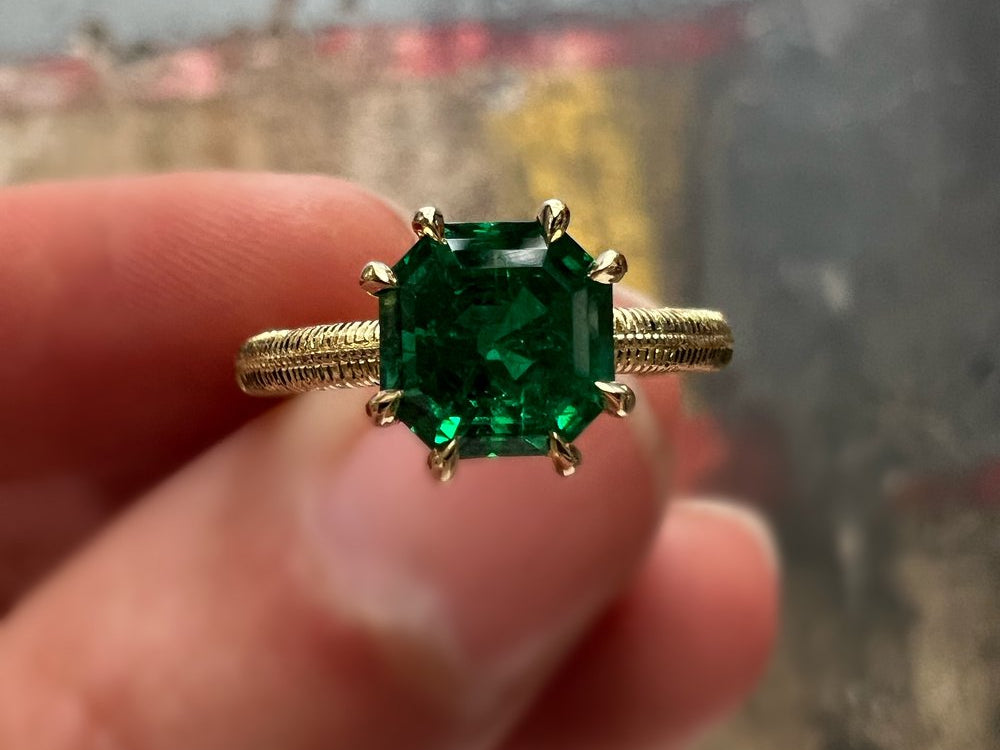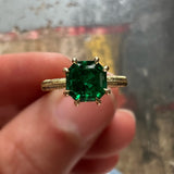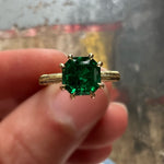 1.5 Carat square emerald cut Colombian emerald set with delicate claw prongs