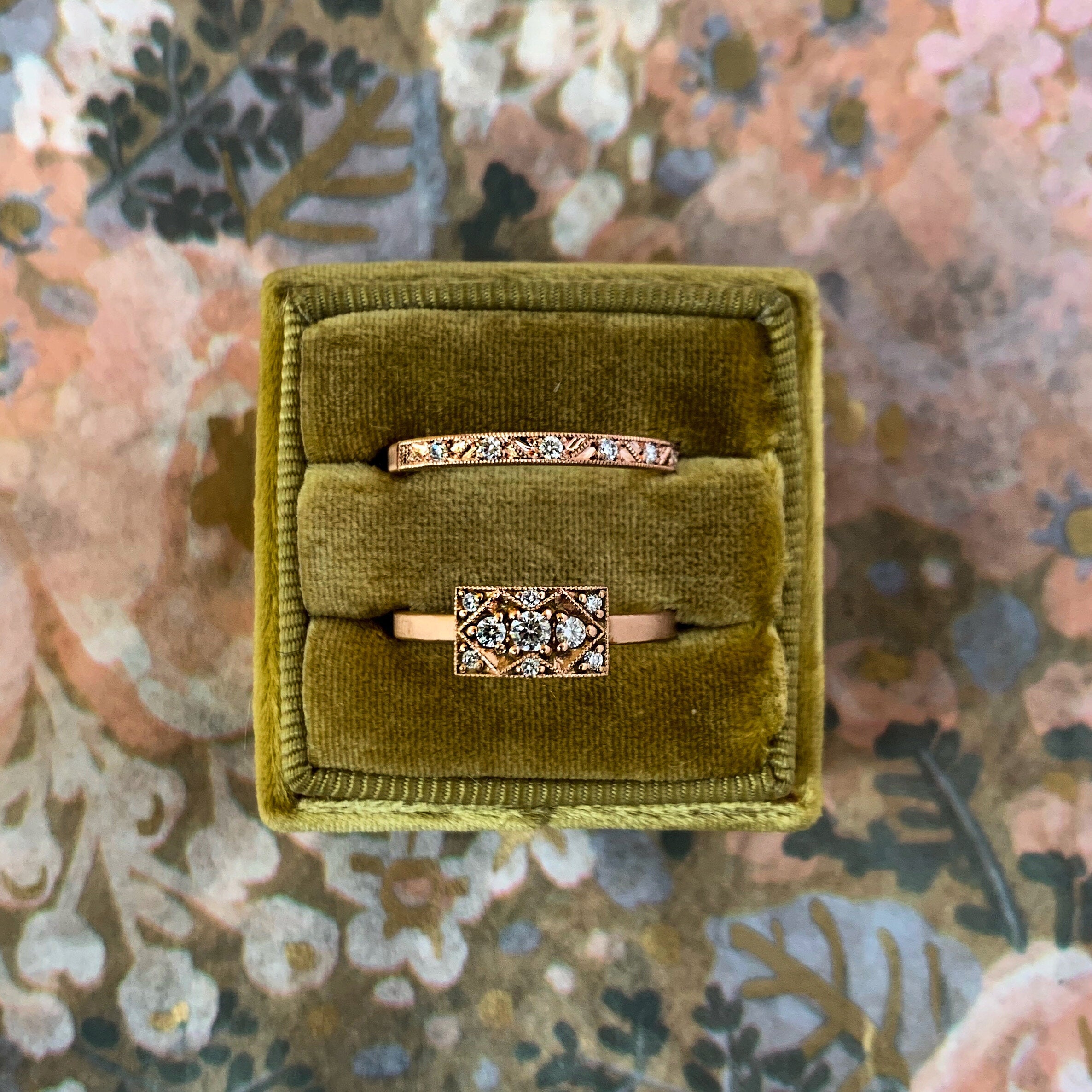 We use 100% recycled precious metals, Canadian-mined diamonds, Montana-mined sapphires, and recycled African-mined diamonds sourced from vintage jewelry. Learn more here.