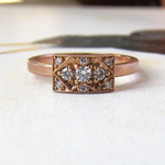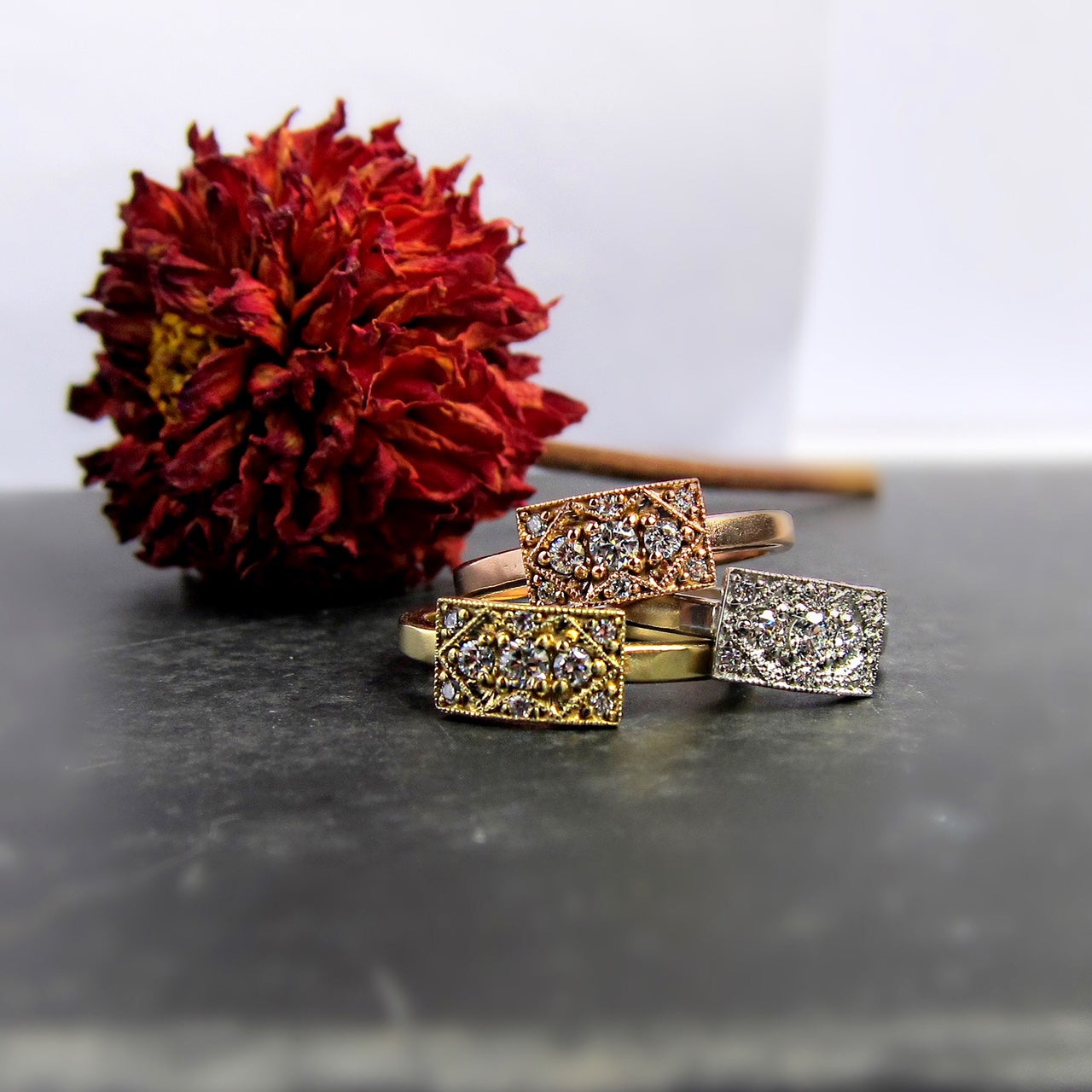 We use 100% recycled precious metals, Canadian-mined diamonds, Montana-mined sapphires, and recycled African-mined diamonds sourced from vintage jewelry. Learn more here.